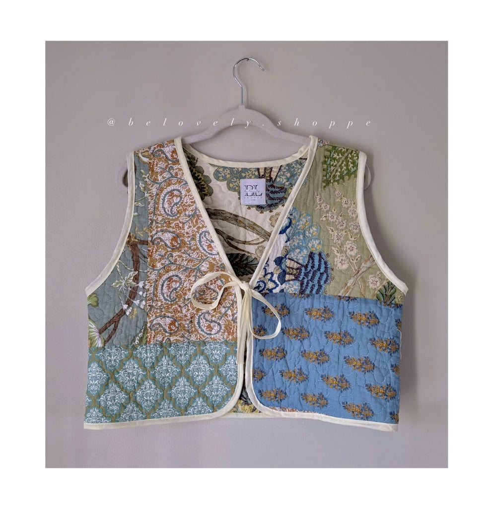 The Jamie vest is crafted with care using pre-loved materials. Its size LRG features a side seam to side seam measurement of 23 inches and a shoulder to hem length of 20 inches.